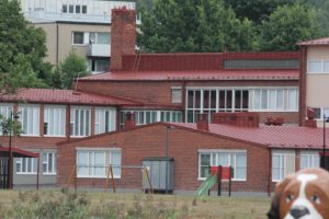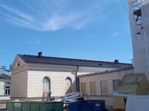 Porvoon Ruotsinkielisen Lukion peltikattojen maalaus kesällä 2022. Kohteessa kunnostettiin vanhoja peltikatteita sekä maalattiin uutta peltiä.