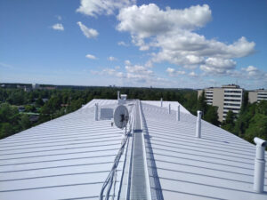 Vuosaaressa sijaitsevaan taloyhtiöön teimme kesällä 2020 paksukalvopinnoituksen sekä asensimme kattosillat.